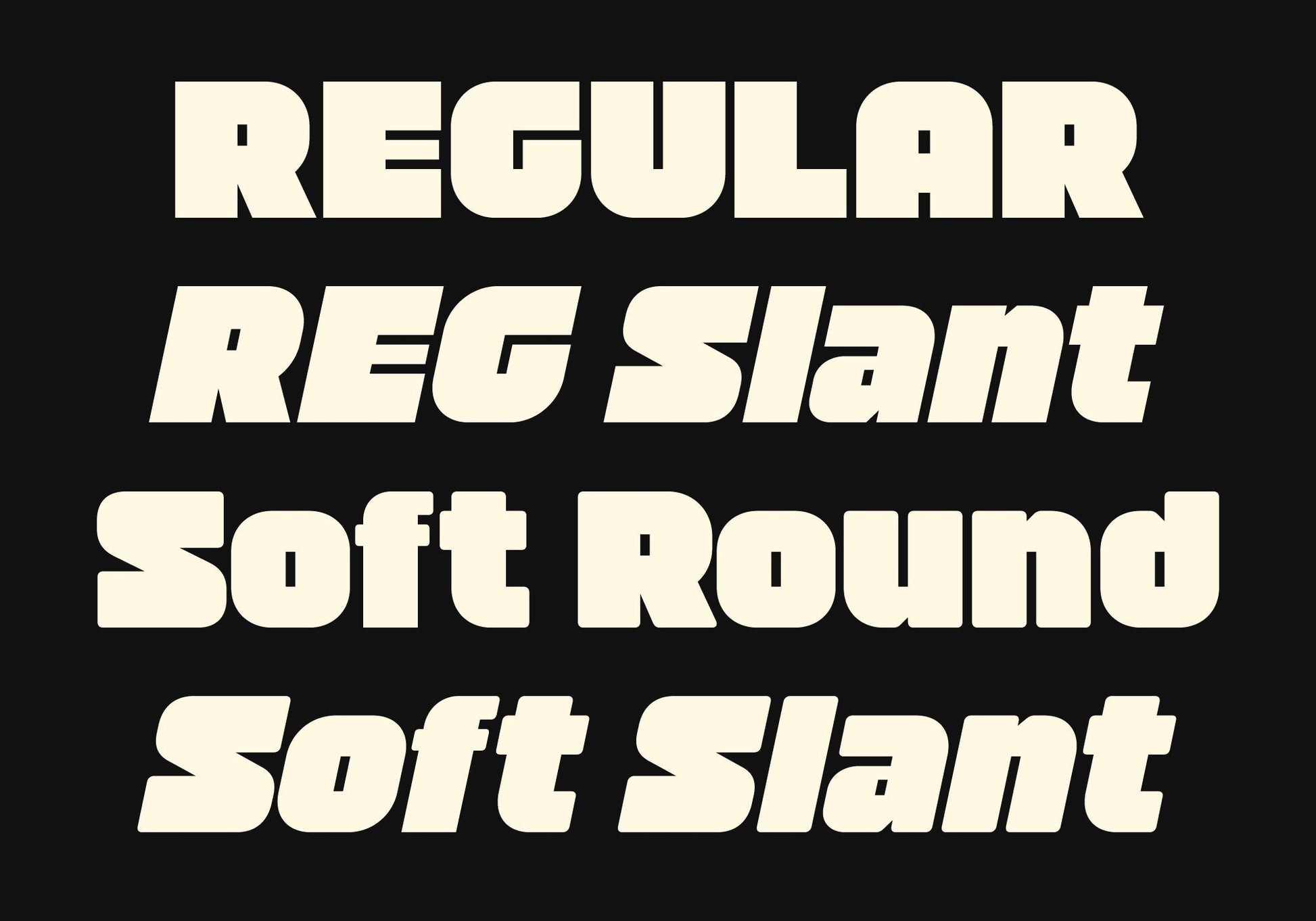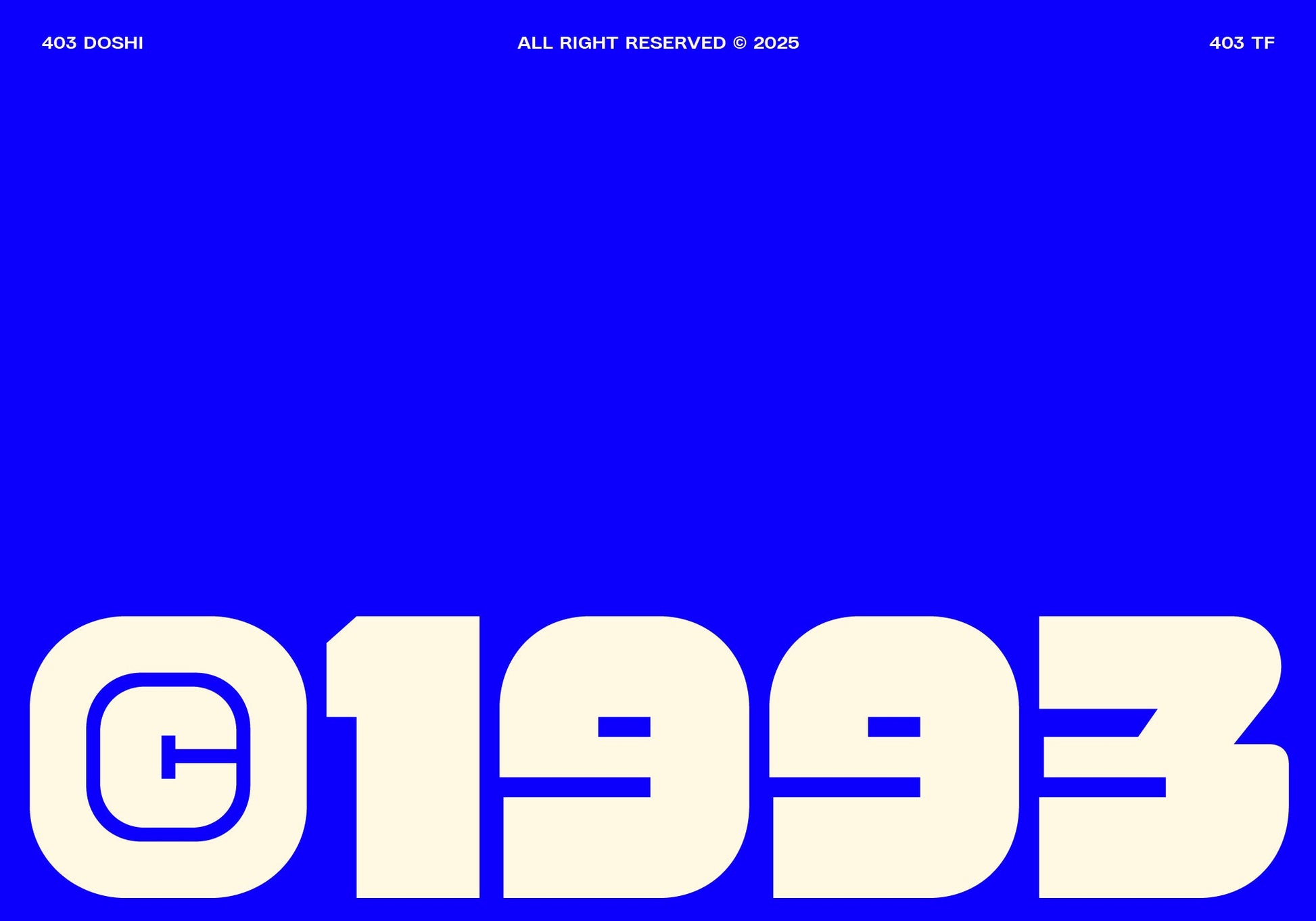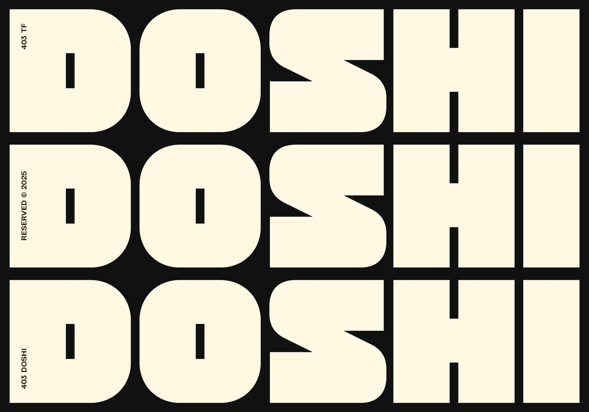 Bold and adaptable, 403 Doshi is a typeface that is meant to have a powerful visual effect. It comes in four different styles: Regular, Soft, Slanted, and Soft Slant. It provides the ideal ratio of smooth curves to geometric accuracy, making it appropriate for a variety of design applications. With 412 glyphs per style and support for 275 languages, 403 Doshi is a genuinely worldwide typeface that can accommodate a wide range of linguistic and creative needs thanks to its broad character set, punctuation, diacritical marks, and symbols. Whether it is used for digital projects, editorial design, branding, or advertising, its aggressive weight guarantees maximum attention while keeping good legibility. 403 Doshi is a vital tool for designers who want to produce work that is distinctive and striking since it can easily adjust to any design issue, from sleek and contemporary to lively and approachable.