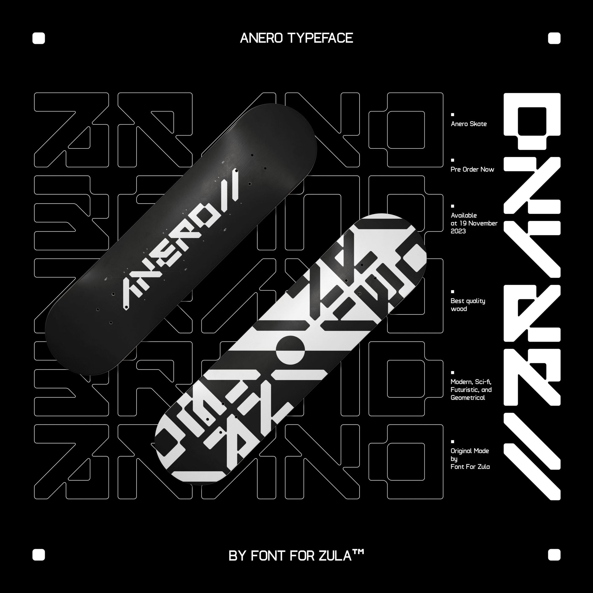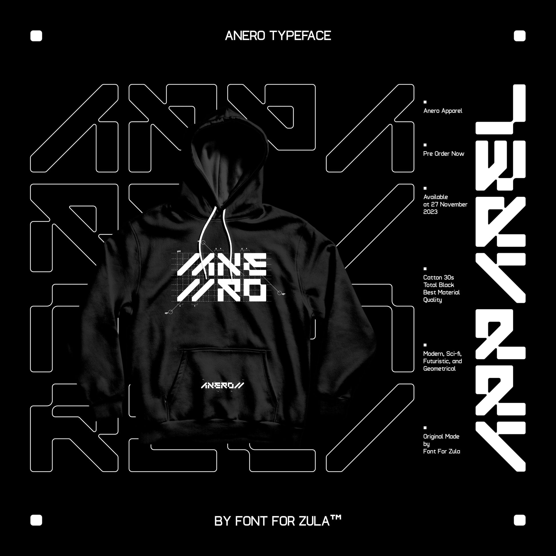 Anero Typeface has a modern, futuristic, geometrical and unique design concept. This typeface is suitable for various purposes such as branding, logos, apparel, and other projects that require a futuristic or hi-tech impression.