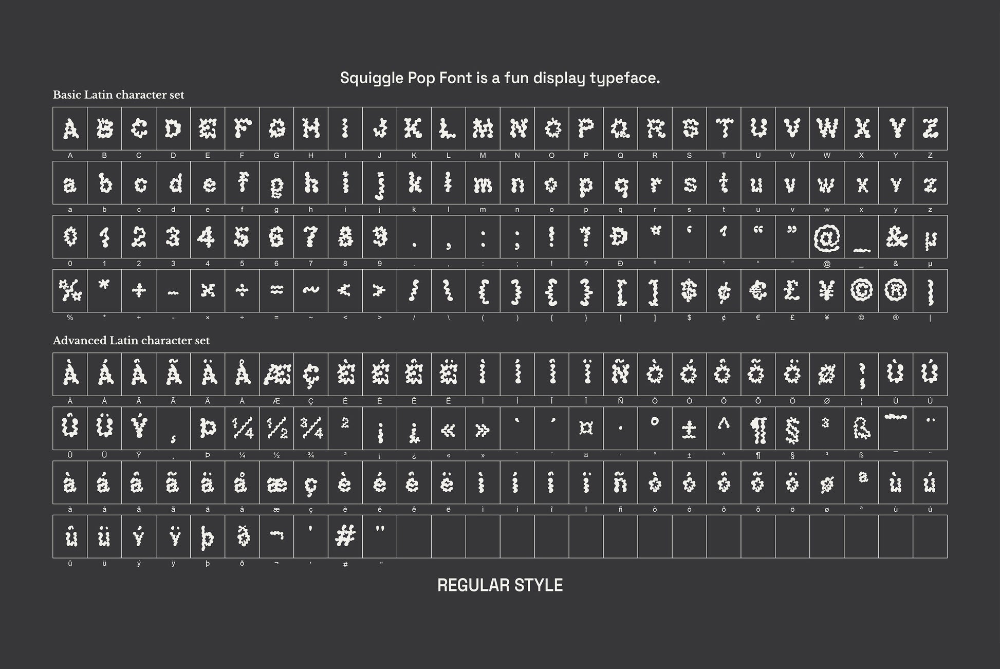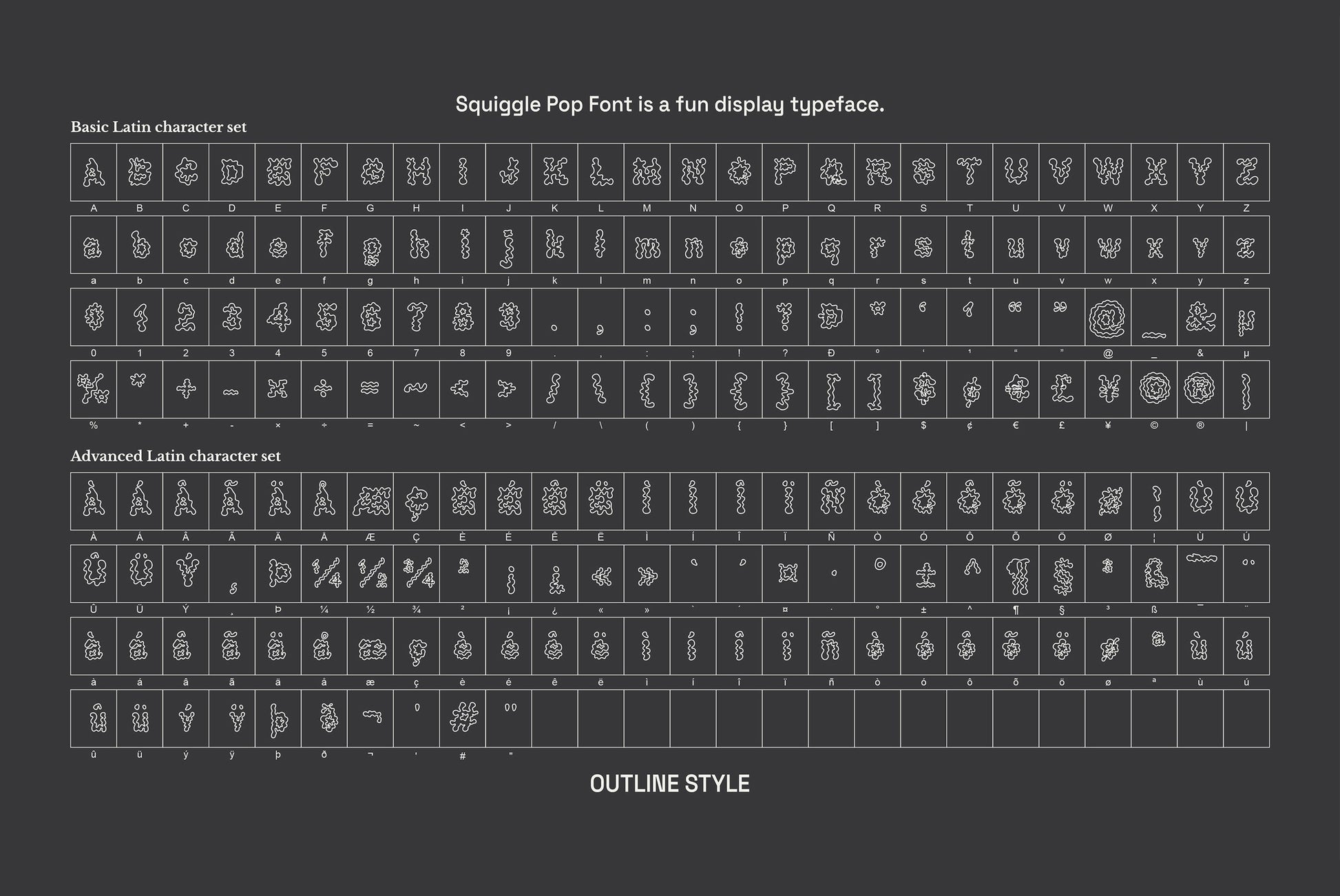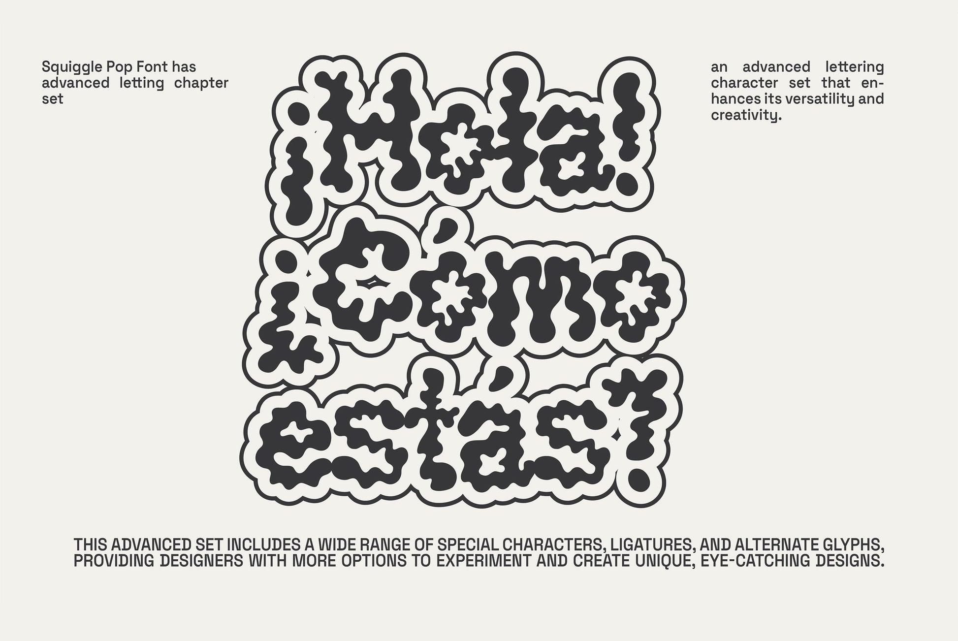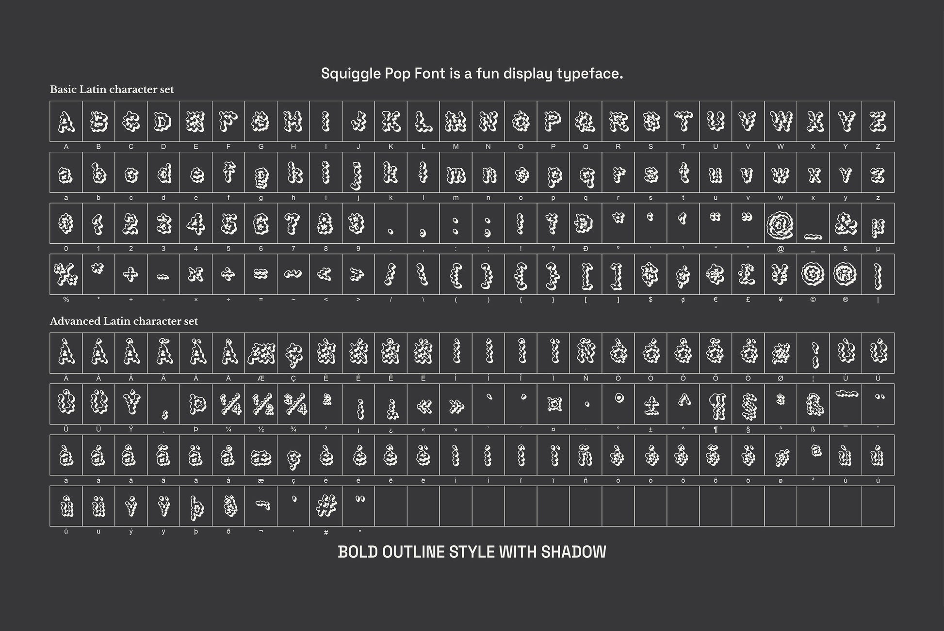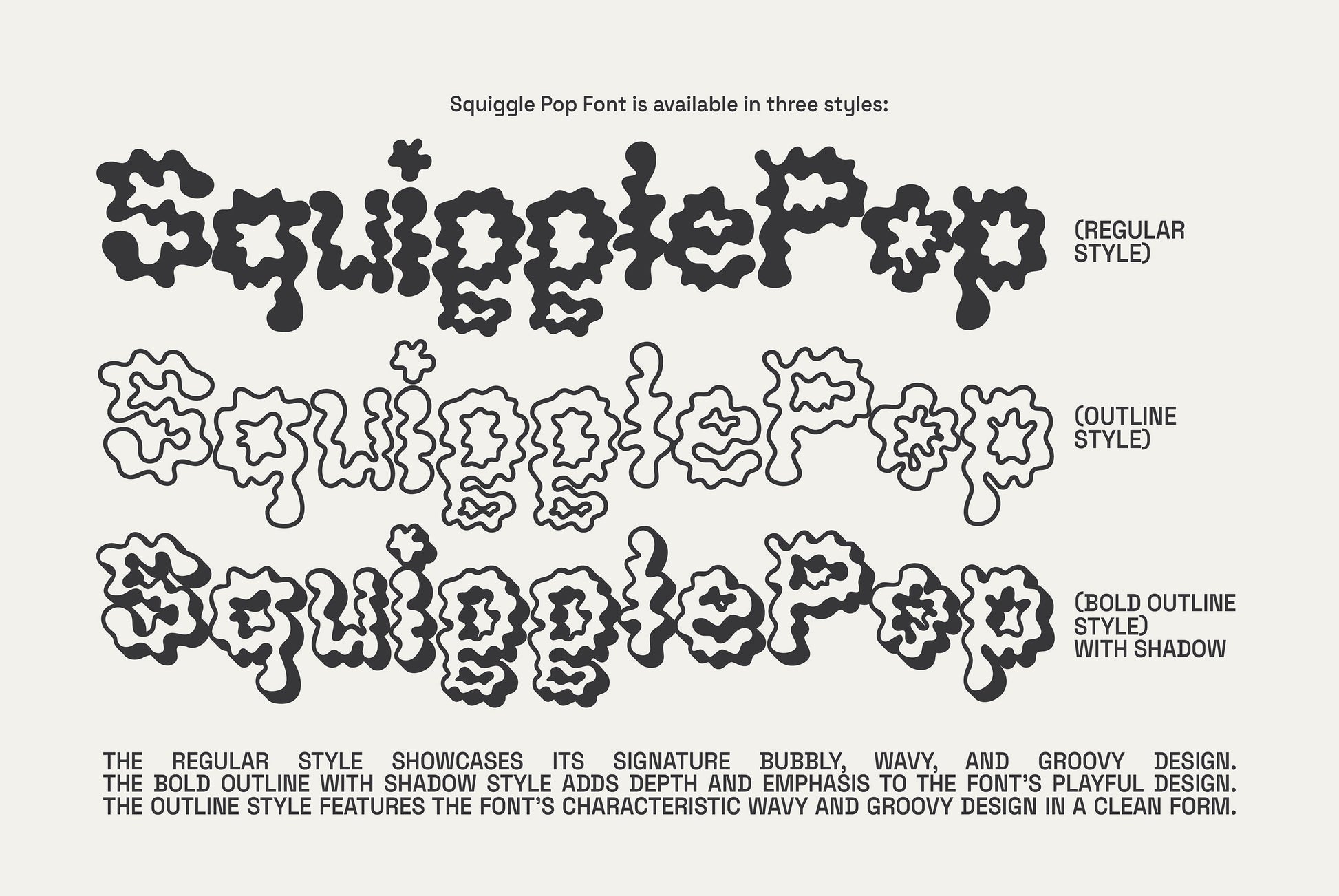Squiggle Pop Font is a fun display typeface featuring a bubbly, wavy, and groovy design. Perfect for adding a playful touch to your projects, this versatile font comes in three styles: regular, bold outline with shadow, and outline. This decorative font works perfectly for bold titles, festival posters, as a graphic element for bright T-shirts or hoodies, or even backgrounds! This weird and ugly typeface likes to experiment with spacing and additional graphic elements. Please, don't hold back on your bold modern ideas! ✦ You will receive: ✦
